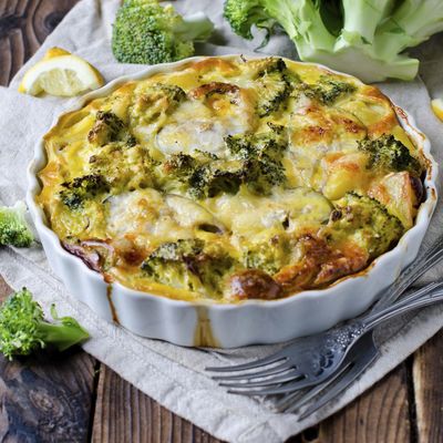 Disposer poulet et brocolis dans un moule, verser la préparation, ajouter le gruyère et cuire 30 min.